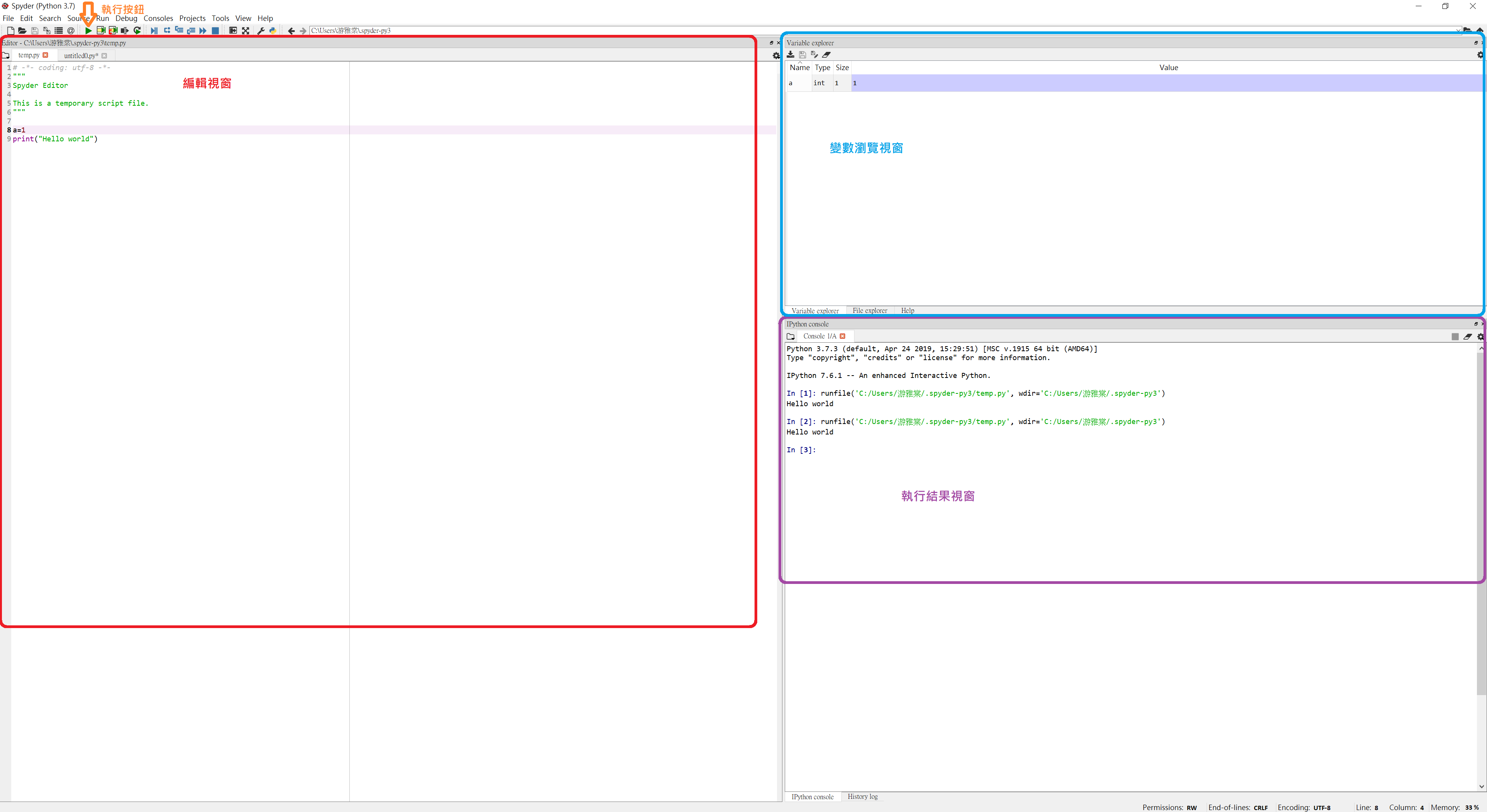 按下執行按紐令程式執行,執行結果會顯示在執行結果視窗;另外,若程式有錯誤出現也會在視窗中呈現。